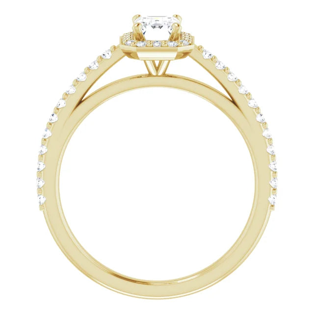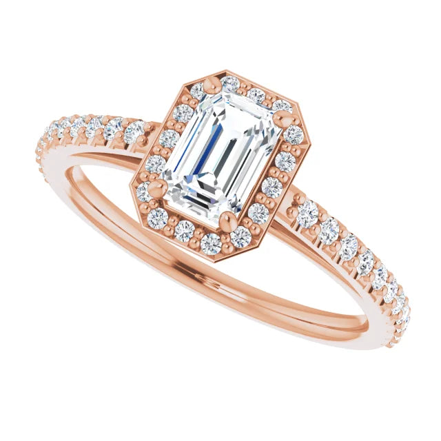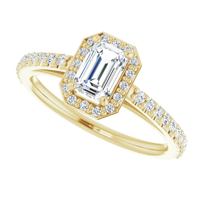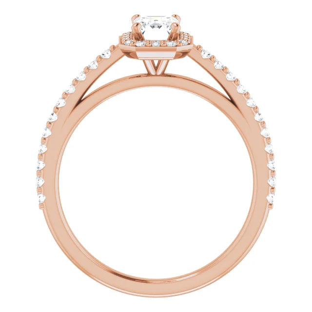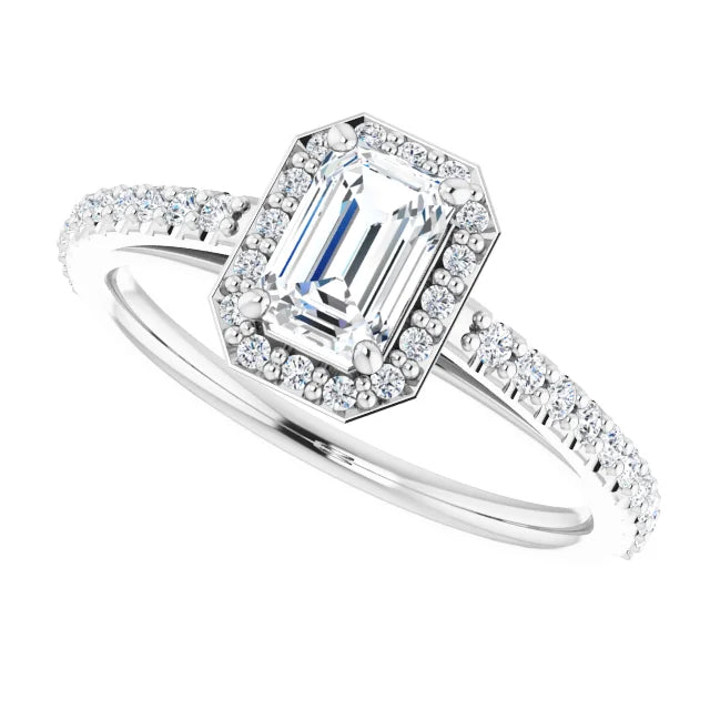 A brilliant 4-prong setting with a pavé set lab grown diamond halo and simple gallery design. Pavé set lab grown diamonds along the band. Handcrafted and made to order for your diamond and ring size.