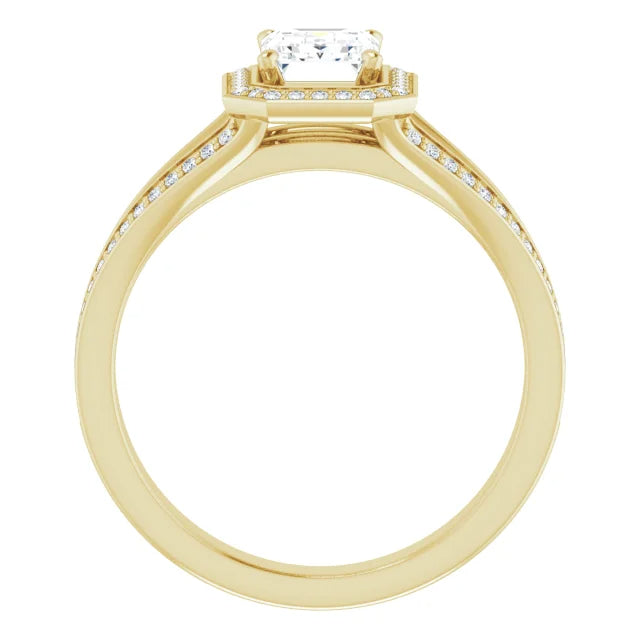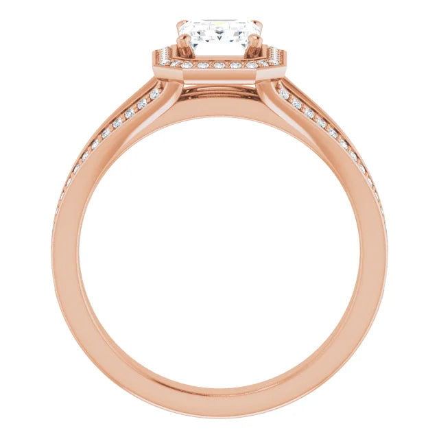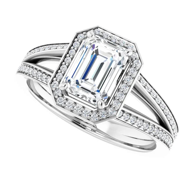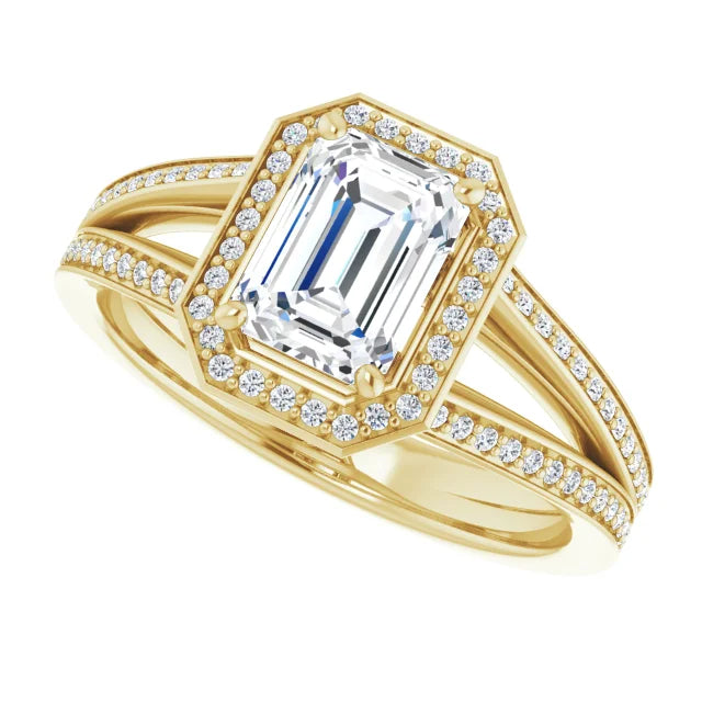 A brilliant 4-prong setting with a bead set lab grown diamond halo and minimalist gallery design. Split shank with bead set lab grown diamonds along the band. Handcrafted and made to order for your diamond and ring size.