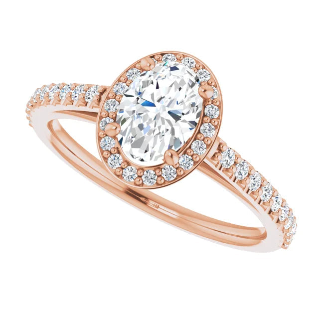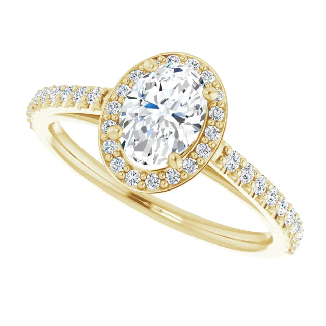 A brilliant 4-prong setting with a pavé set lab grown diamond halo and simple gallery design. Pavé set lab grown diamonds along the band. Handcrafted and made to order for your diamond and ring size.