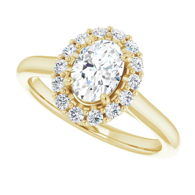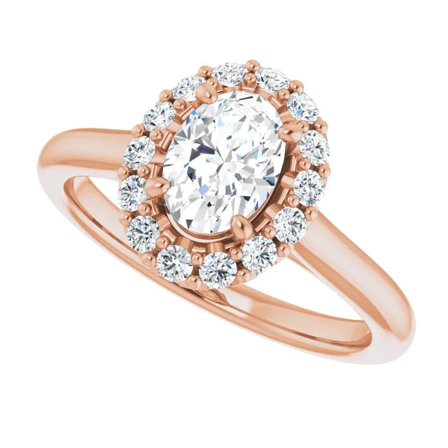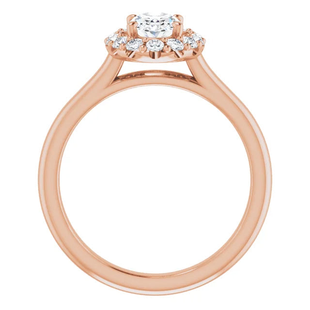 A brilliant 4-prong setting with a pavé set lab grown diamond halo and minimalist gallery design. Handcrafted and made to order for your diamond and ring size.