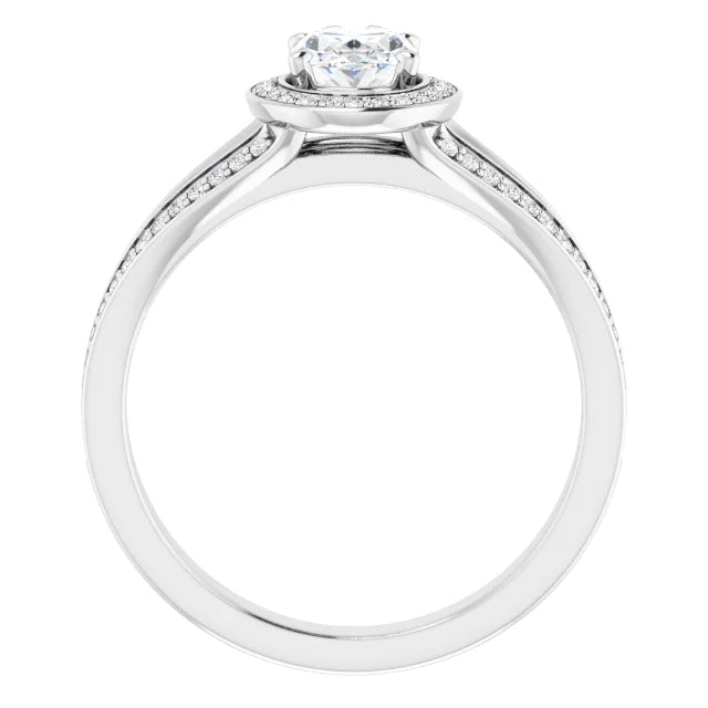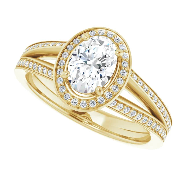 A brilliant 4-prong setting with a bead set lab grown diamond halo and minimalist gallery design. Split shank with bead set lab grown diamonds along the band. Handcrafted and made to order for your diamond and ring size.