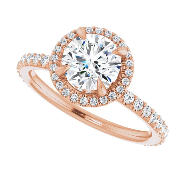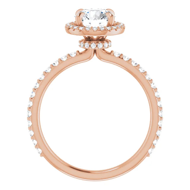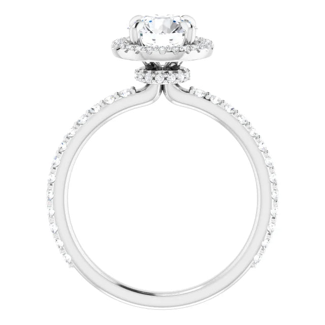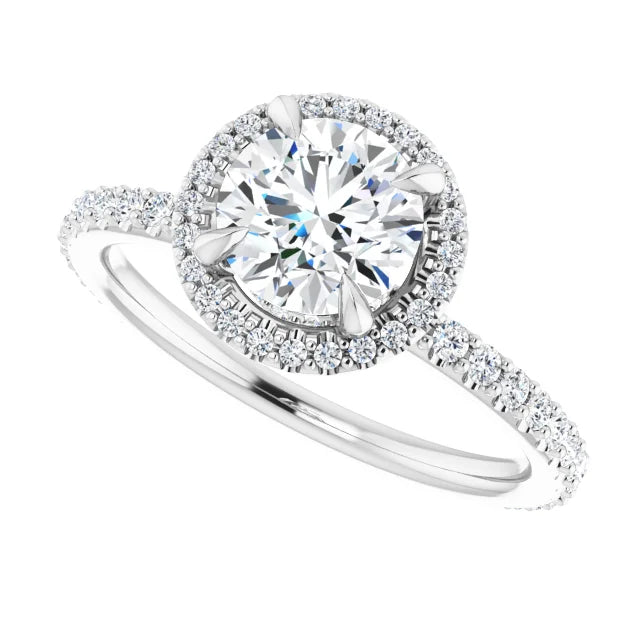 A brilliant 4-prong setting with a pavé set lab grown diamond halo and lab grown diamond crown gallery. Pavé set lab grown diamonds along the band. Handcrafted and made to order for your diamond and ring size.