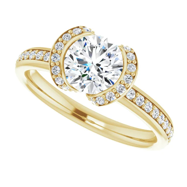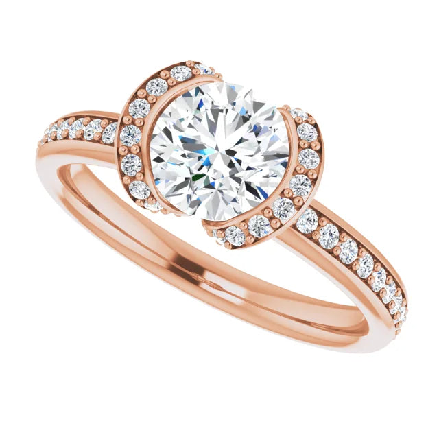 A unique bezel setting with a bead set lab grown diamond halo and minimalist gallery design. Bead set lab grown diamonds along the band. Handcrafted and made to order for your diamond and ring size.